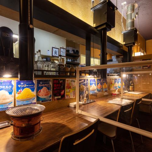 【カウンター席】お一人様でも気軽にご利用いただけるカウンター席をご用意しております。間仕切りを設置しており、感染症対策も万全です。一人焼肉やデートで隣り合わせでお食事されたい時、お仕事帰りの一杯や、気軽なお食事にもお気軽にご来店ください♪